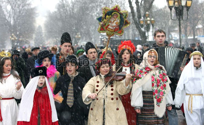 Участники вертепа в специальных рождественских костюмах колядуют в центре Львова, во вторник, 8 января 2008 г. Во Львове начался фестиваль рождественских колядок ”Спалах Різдвяної зорі”. Участие в фестивале принимают взрослые и дети. Коляда - славянский праздник зимнего сонцеворота, который приходится на 25 декабря. Коляда проходит с 7 по 19 января. Этот праздник еще называют Даждьбожий день или Карачун. Фото УНИАН
