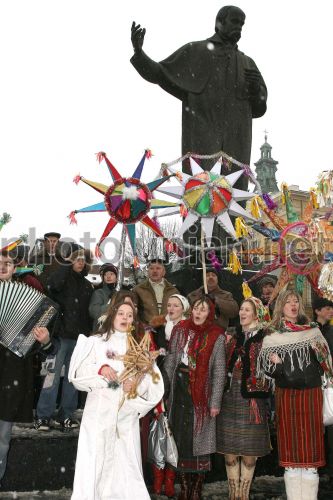 Участники вертепа в специальных рождественских костюмах колядуют возле монумента Т.Г. Шевченку в центре Львова, во вторник, 8 января 2008 г. Во Львове начался фестиваль рождественских колядок ”Спалах Різдвяної зорі”. Участие в фестивале принимают взрослые и дети. Коляда - славянский праздник зимнего сонцеворота, который приходится на 25 декабря. Коляда проходит с 7 по 19 января. Этот праздник еще называют Даждьбожий день или Карачун. Фото УНИАН