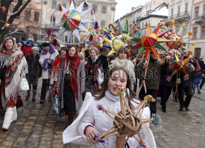 Участники праздничного шествия колядуют в центре Львова, во вторник, 8 января 2008 г. Во Львове начался фестиваль рождественских колядок ”Спалах Різдвяної зорі”. Участие в фестивале принимают взрослые и дети. Коляда - славянский праздник зимнего сонцеворота, который приходится на 25 декабря. Коляда проходит с 7 по 19 января. Этот праздник еще называют Даждьбожий день или Карачун. Фото УНИАН