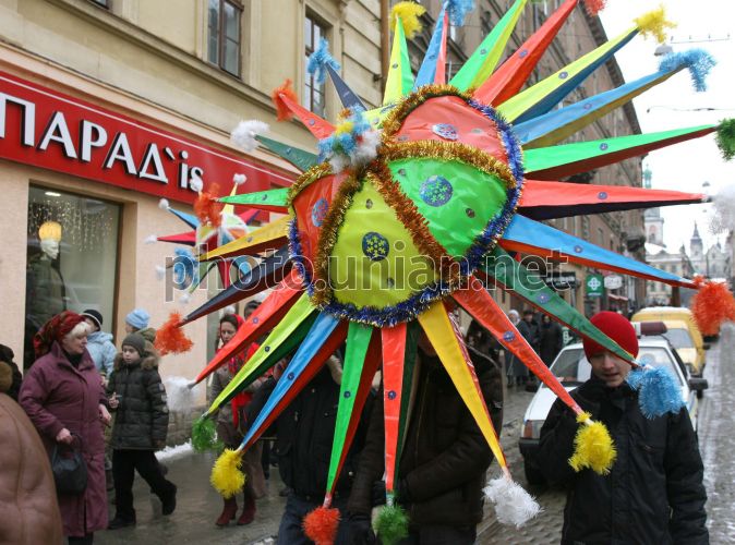 Участники праздничного шествия колядуют в центре Львова, во вторник, 8 января 2008 г. Во Львове начался фестиваль рождественских колядок ”Спалах Різдвяної зорі”. Участие в фестивале принимают взрослые и дети. Коляда - славянский праздник зимнего сонцеворота, который приходится на 25 декабря. Коляда проходит с 7 по 19 января. Этот праздник еще называют Даждьбожий день или Карачун. Фото УНИАН
