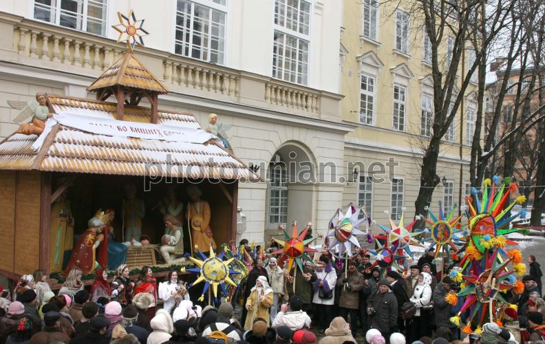 Участники праздничного шествия колядуют возле Большой шопки в центре Львова, во вторник, 8 января 2008 г. Во Львове начался фестиваль рождественских колядок ”Спалах Різдвяної зорі”. Участие в фестивале принимают взрослые и дети. Коляда - славянский праздник зимнего сонцеворота, который приходится на 25 декабря. Коляда проходит с 7 по 19 января. Этот праздник еще называют Даждьбожий день или Карачун. Фото УНИАН
