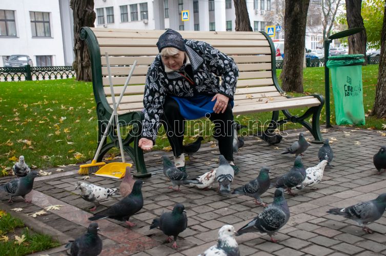 Пожилая женщина кормит голубей в парке в Харькове, 4 ноября 2020 г. Фото Мариенко Андрей / УНИАН