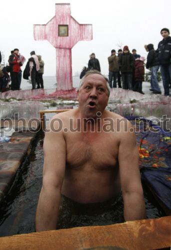 Мужчина купается в проруби во время ежегодного православного праздника Крещения Господня в Вышгороде (Киевская обл.), в субботу, 19 января 2008 г. В этот день все православные христиане и греко-католики отмечают Крещение Господне. Верующие вспоминают о том, как в возрасте 30 лет Иисус из Галилеи пришел к реке Иордан, чтобы принять крещение водой от Иоанна Предтечи. Фото Евгения Орловского / УНИАН