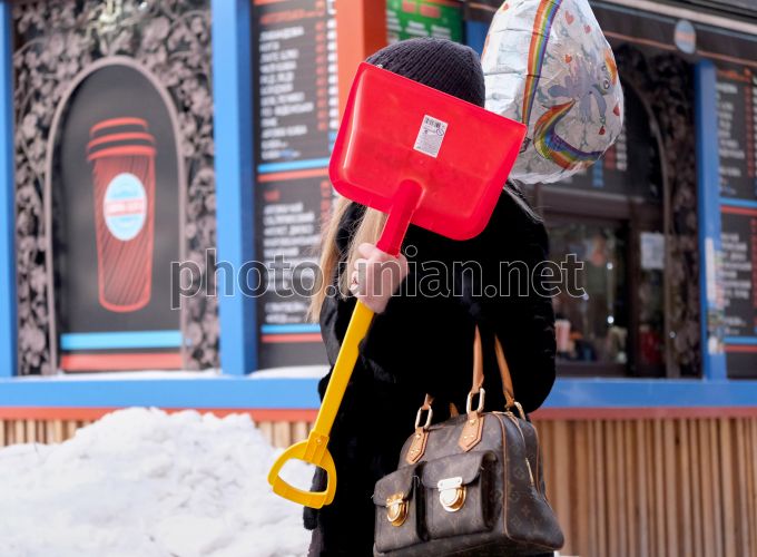 Девушка с пластиковой лопатой и воздушным шариком в Киеве, 14 февраля 2021 г. Фото УНИАН / УНИАН