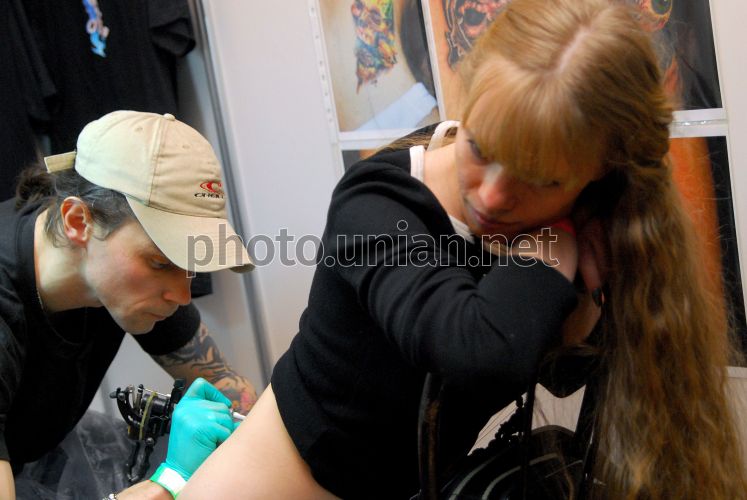 Мастер по художественному татуированию наносит рисунок на тело девушке на фестивале тату, пирсинга и боди-арта ”Tattoo-House Fest” в Киеве, в субботу, 2 февраля 2008 г. Посетители фестиваля, который будет проходить 2-3 февраля, будут иметь возможность не только посмотреть на работу мастеров, но и себе сделать татуировку. В музыкальной части фестиваля примут участие киевские и московские музыкальные группы. Фото Дмитрия Куприяна / УНИАН