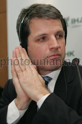 Руководитель дирекции по развитию международного розничного банкинга ”Credit Agricole S.A.” Марк Карлос на пресс-конференции в Киеве в пятницу, 15 февраля 2008 г. Пресс-конференция была посвящена 15-летию ”ИНДЭКС-БАНК”. Фото УНИАН