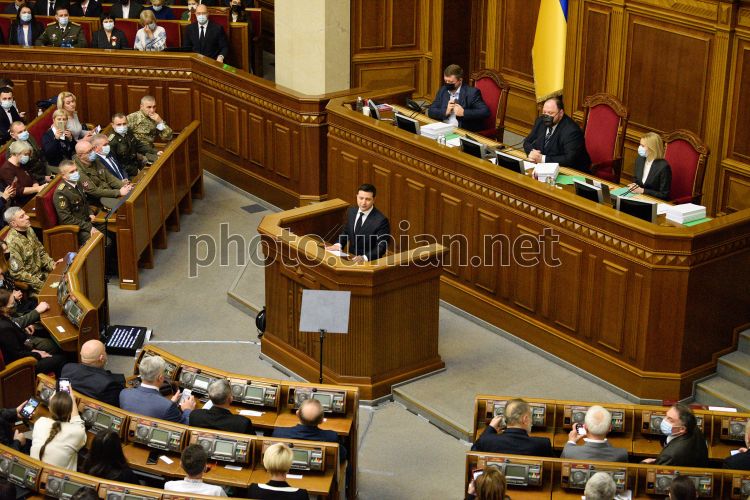 Президент Украины Владимир Зеленский выступает в парламенте с ежегодным посланием к Верховной Раде Украины о внутреннем и внешнем положении Украины, 1 декабря 2021 г. Фото Полищук Максим / УНИАН