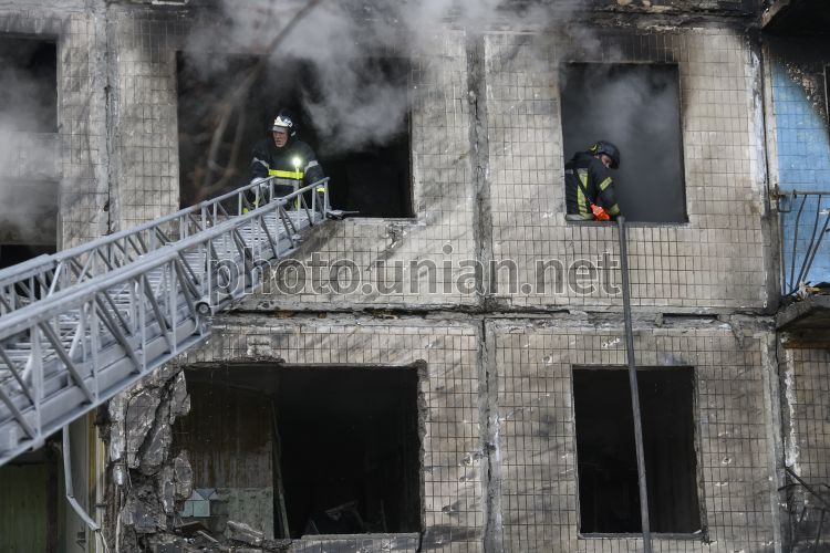 Последствия пожара после попадания снаряда в жилой дом в Киеве