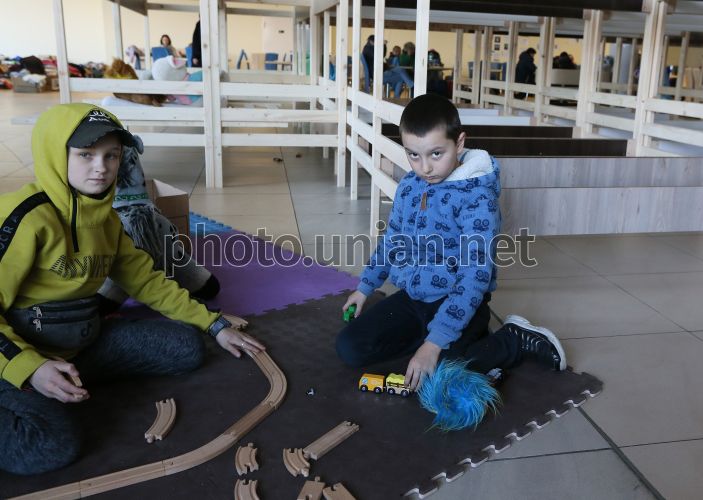 Дети-переселенцы играют в пункте для временного пребывания беженцев, во Львове, 25 марта 2022 г. С начала полномасштабного вооруженного вторжения россии в Украину во Львове заработала круглосуточная линия психологической поддержки для всех, кто в ней нуждается. Такую помощь оказывают специалисты Львовского городского центра социальных служб, работающих в большинстве пунктов для временного пребывания вынужденных беженцев. Психологи работают со взрослыми и детьми. В ночь на 24 февраля 2022 года Россия начала полномасштабную войну с Украиной, Путин назвал ее «военной операцией». РФ начала обстрелы украинских городов. Фото Кравс Евгений / УНИАН