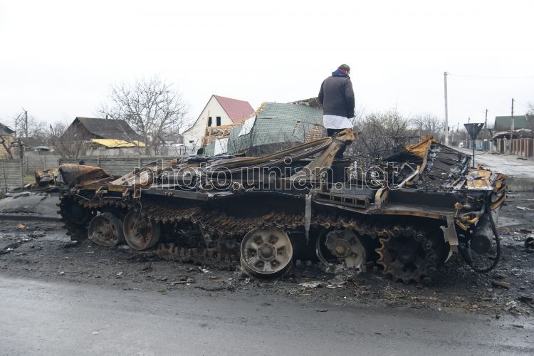 Уничтоженная российская военная техника в селе Дмитровка (Киевская область), 2 апреля 2022 г. 31 марта спецподразделения Главного управления разведки с другими подразделениями ВСУ приняли участие в операции по освобождению населенных пунктов Дмитровка и Капитановка Бучанского района Киевской области. У оккупантов была 21 единица тяжелой техники, БМП и танки. В то же время, со стороны украинских сил зашло 8 танков, пехота ВСУ и группа спецназовцев ГРУ. В результате операции враг понес потери – 9 единиц тяжелой техники, БМП и танки. Живая сила была уничтожена до 50 человек пехоты. Основная масса врагов была уничтожена, другая – отступила. Фото Мусиенко Владислав / УНИАН