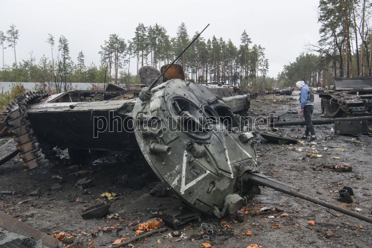 Уничтоженная российская военная техника в селе Дмитровка (Киевская область), 2 апреля 2022 г. 31 марта спецподразделения Главного управления разведки с другими подразделениями ВСУ приняли участие в операции по освобождению населенных пунктов Дмитровка и Капитановка Бучанского района Киевской области. У оккупантов была 21 единица тяжелой техники, БМП и танки. В то же время, со стороны украинских сил зашло 8 танков, пехота ВСУ и группа спецназовцев ГРУ. В результате операции враг понес потери – 9 единиц тяжелой техники, БМП и танки. Живая сила была уничтожена до 50 человек пехоты. Основная масса врагов была уничтожена, другая – отступила. Фото Мусиенко Владислав / УНИАН