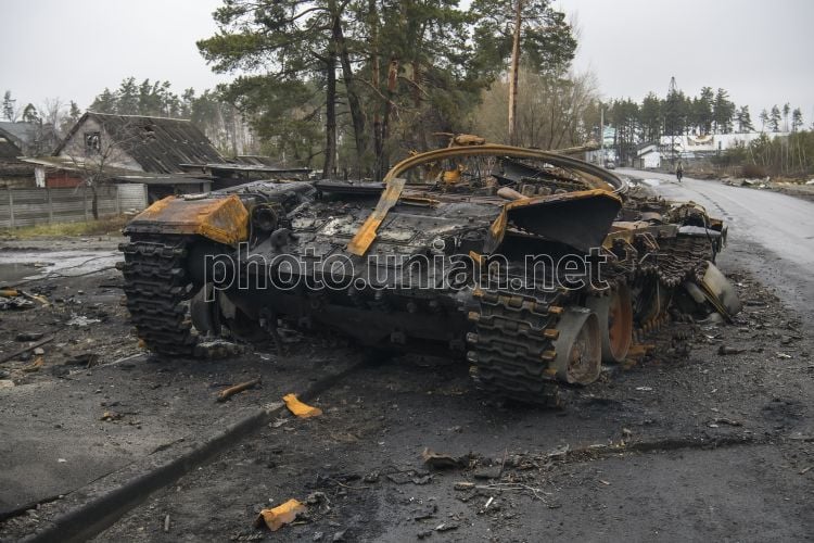 Уничтоженная российская военная техника в селе Дмитровка (Киевская область), 2 апреля 2022 г. 31 марта спецподразделения Главного управления разведки с другими подразделениями ВСУ приняли участие в операции по освобождению населенных пунктов Дмитровка и Капитановка Бучанского района Киевской области. У оккупантов была 21 единица тяжелой техники, БМП и танки. В то же время, со стороны украинских сил зашло 8 танков, пехота ВСУ и группа спецназовцев ГРУ. В результате операции враг понес потери – 9 единиц тяжелой техники, БМП и танки. Живая сила была уничтожена до 50 человек пехоты. Основная масса врагов была уничтожена, другая – отступила. Фото Мусиенко Владислав / УНИАН