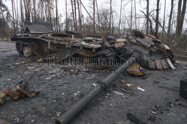 Уничтоженная российская военная техника в селе Дмитровка (Киевская область), 2 апреля 2022 г. 31 марта спецподразделения Главного управления разведки с другими подразделениями ВСУ приняли участие в операции по освобождению населенных пунктов Дмитровка и Капитановка Бучанского района Киевской области. У оккупантов была 21 единица тяжелой техники, БМП и танки. В то же время, со стороны украинских сил зашло 8 танков, пехота ВСУ и группа спецназовцев ГРУ. В результате операции враг понес потери – 9 единиц тяжелой техники, БМП и танки. Живая сила была уничтожена до 50 человек пехоты. Основная масса врагов была уничтожена, другая – отступила. Фото Мусиенко Владислав / УНИАН
