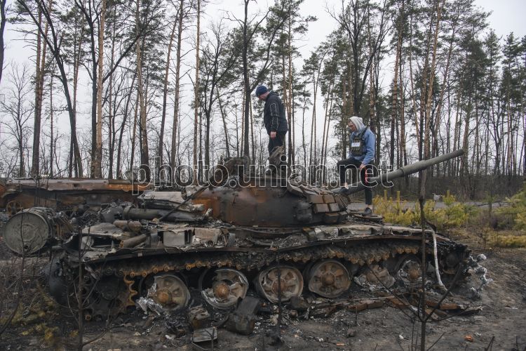 Уничтоженная российская военная техника в селе Дмитровка (Киевская область), 2 апреля 2022 г. 31 марта спецподразделения Главного управления разведки с другими подразделениями ВСУ приняли участие в операции по освобождению населенных пунктов Дмитровка и Капитановка Бучанского района Киевской области. У оккупантов была 21 единица тяжелой техники, БМП и танки. В то же время, со стороны украинских сил зашло 8 танков, пехота ВСУ и группа спецназовцев ГРУ. В результате операции враг понес потери – 9 единиц тяжелой техники, БМП и танки. Живая сила была уничтожена до 50 человек пехоты. Основная масса врагов была уничтожена, другая – отступила. Фото Мусиенко Владислав / УНИАН