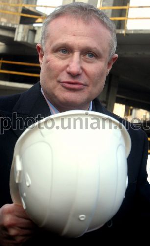 Руководитель Федерации футбола Украины Григорий Суркис на стройплощадке во время начала демонтажа недостроенного торгово-развлекательного центра “Троицкий”, перед НСК “Олимпийский” в Киеве, в четверг, 20 марта 2008 г. Задачу демонтировать ТРЦ “Троицкий” поставил Кабмин по требованию европейского футбольного сообщества, поскольку размещение здания противоречит правилам эвакуации зрителей со стадиона. Правительство Украины достигло договоренности с застройщиками о сносе верхней части ТРЦ «Троицкий». Неудовлетворительное состояние стадионов ставит под сомнение проведение Евро-2012 в Украине. Фото Александра Синицы / УНИАН