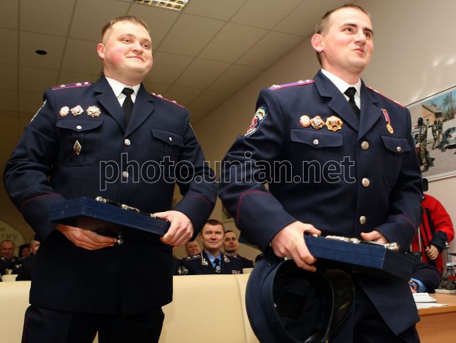 Начальник сектора противодействия взяточничества ВДСБЕЗ УМВД Украины в г. Севастополе, подполковник милиции Алексей Хлебников и заместитель начальника отдела борьбы с коррупцией УБОЗ ГУМВД в г. Киеве, майор милиции Александр Гуцал во время награждения на выездном заседании коллегии МВД Украины под председательством министра внутренних дел Украины Юрия Луценко в Виннице, в субботу, 22 марта 2008 г. Во время коллегии министр внутренних дел положил начало новой традиции отмечать лучших милиционеров специальным отличием МВД «Казацкая слава». Первыми получили сувенирный кортик начальник сектору противодействия взяточничества ВДСБЕЗ УМВД Украины в г. Севастополе, подполковник милиции Алексей Хлебников, справа, (при разоблачении получения взятки в размере 450 тыс. долларов) и заместитель начальника отдела борьбы с коррупцией УБОЗ ГУМВС в г. Киеве, майор милиции Александр Гуцал, под руководством которого было задержано высокопоставленное должностное лицо со взяткой в сумме 500 тыс. долларов. Фото Александра Косарева / POOL / УНИАН