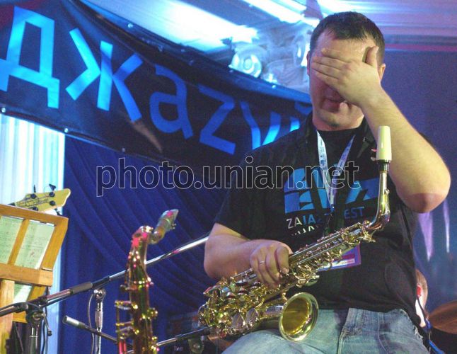 Днепропетровский саксофонист вытирает пот во время выступления на фестивале «KHARKIV ZA JAZZ FEST» в здании областной филармонии в Харькове в пятницу, 21 марта 2008 г. Фото Владимира Андреева / УНИАН