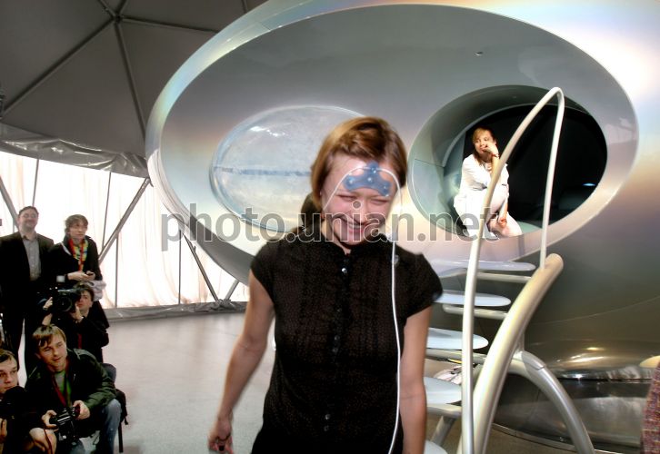 Журналистка после ознакомления с одной из работ японской художницы Марико Мори под названием ”Wave UFO”, во время пресс-показа выставки “Oneness” («Единение»), в Киеве в пятницу, 11 апреля 2008 г. Марико Мори считается одной из самых выдающихся фигур современного арт-мира Японии. В работах художницы присутствует влияние современной поп-культуры, моды, дизайна, музыки, буддизма, синтоизма и научной фантастики. Художница работает в многочисленных жанрах: живопись, фотография, 3D-видео, скульптура, инсталляция и перформанс. Основной идеей ее творчества является контраст между утопией и реальностью. Фото Александра Синицы / УНИАН
