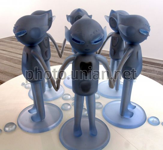 Интерактивная инсталляция японской художницы Марико Мори, представляющая 6 инопланетян высотой в 1 метр, взявшихся за руки, на выставке “Oneness” («Единение»), в Киеве в пятницу, 11 апреля 2008 г. Выставка “Oneness” («Единение») получила свое название от данной работы, созданной художницей в 2003 г. после теракта 11 сентября 2001 г. в Нью-Йорке. Эта работа Марико Мори является метафорой, олицетворяющей неприятие обществом людей, отличных от них, и призывающая преодолеть устоявшиеся стереотипы. Марико Мори считается одной из самых выдающихся фигур современного арт-мира Японии. В работах художницы присутствует влияние современной поп-культуры, моды, дизайна, музыки, буддизма, синтоизма и научной фантастики. Художница работает в многочисленных жанрах: живопись, фотография, 3D-видео, скульптура, инсталляция и перформанс. Основной идеей ее творчества является контраст между утопией и реальностью. Фото Александра Синицы / УНИАН