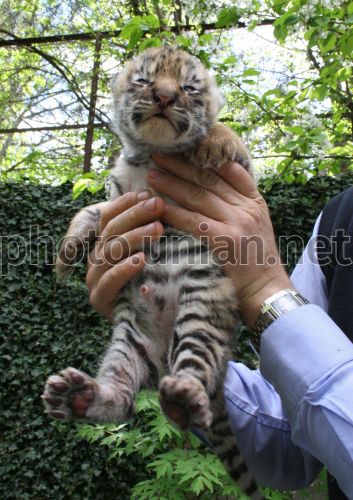 Новорожденный тигренок в зоопарке "Сказка" в Ялте, в понедельник, 21 апреля 2008 г. Ялтинский зоопарк пополнился новыми питомцами — здесь родились три амурских тигренка. Тройня появилась на свет 16 апреля у пары амурских тигров Яны и Улара. Рождение этих малышей — значительное событие не только для зоопарка, ведь амурский тигр — очень редкое животное, находящееся под угрозой исчезновения. Так, в настоящее время в мире насчитывается всего несколько сотен амурских тигров. В зоопарках нашей страны до рождения малышей было 14 амурских тигров, семеро из них жили в Ялте. Фото Алексея Сувирова / УНИАН
