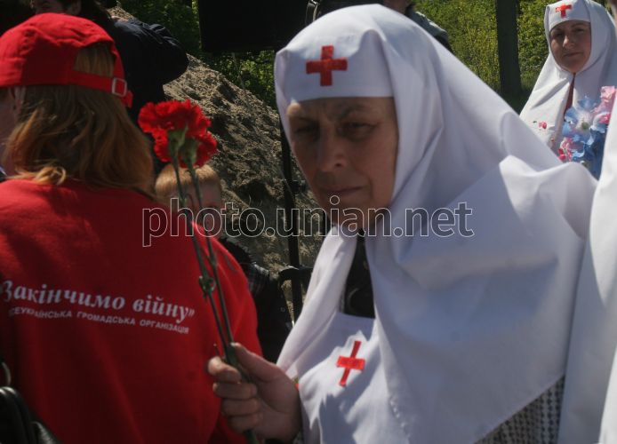 Сестра милосердия держит красную гвоздику во время церемонии перезахоронения останков 65 погибших при обороне Киева солдат, 60-й армии генерала И. Черняховского в с. Ясногородка Вышгородского района Киевской обл., в пятницу, 9 мая 2008 г. Церемония перезахоронения организована по случаю 63-й годовщины Победы в Великой Отечественной войне. Фото Александра Синицы / УНИАН