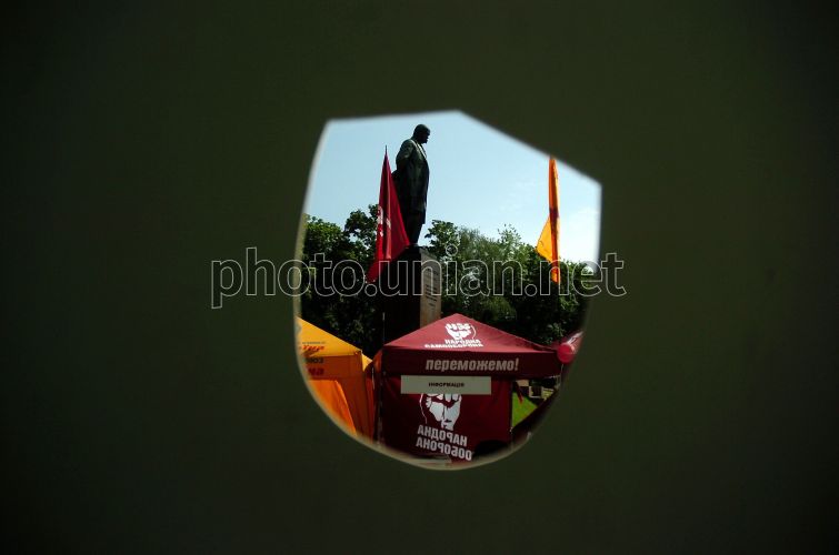 Памятник Тарасу Шевченко перед началом представления экспериментального Театра уличной сатиры «Политический вертеп» «Битва за Киев» в парке имени Шевченко в Киеве во вторник, 20 мая 2008 г. Во время акции активисты открыто высмеивали наиболее ярких претендентов на пост мэра Киева. Фото УНИАН