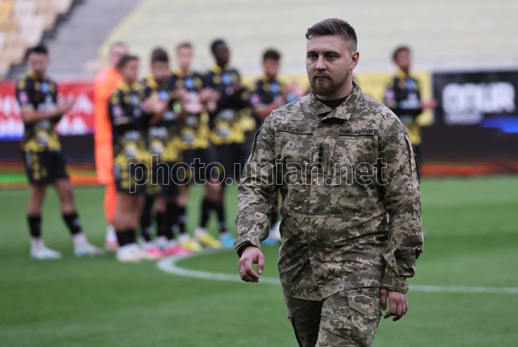 Военный вышел на поле, чтобы выполнить символический удар по мячу, во время матча 7-го тура Чемпионата Украины по футболу среди команд УПЛ (Премьер-Лига) сезона 2025/2026 между ФК «Рух» (Львов) и ФК «Шахтер» (Донецк) на стадионе «Арена Львов» во Львове, 28 сентября 2025 г. Матч закончился со счетом 0:4 в пользу ФК "Шахтер" (Донецк). Фото Кравс Евгений / УНИАН