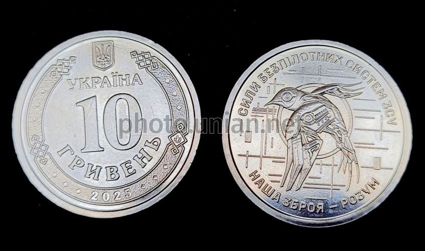 ФОТО С МОБИЛЬНОГО ТЕЛЕФОНА Новые оборотные памятные монеты "Силы беспилотных систем ВСУ" во время презентации в здании НБУ в Киеве, 30 сентября 2025 г. Фото Синица Александр / УНИАН