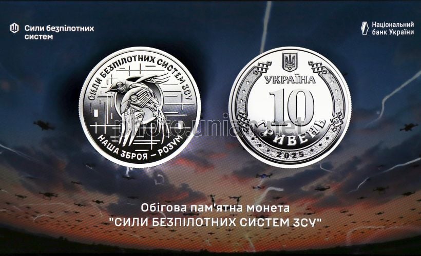 Изображение новой памятной монеты «Силы беспилотных систем ВСУ» на экране монитора во время презентации монеты накануне Дня защитников и защитниц Украины, в здании НБУ в Киеве, 30 сентября 2025 г. Новая монета продолжает серию "Вооруженные Силы Украины", имеет номинал 10 гривен, изготовлена из сплава на основе цинка с никелевым покровом. Дизайн реверса монеты создала Татьяна Балута, аверса – Владимир Демьяненко. Скульптор – Владимир Демьяненко. Фото Синица Александр / УНИАН