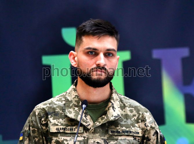 Временно исполняющий обязанности командующего Сил беспилотных систем Вооруженных Сил Украины майор Александр Тарасенко во время презентации новой оборотной памятной монеты «Силы беспилотных систем ВСУ» накануне Дня защитников и защитниц Украины, в здании НБУ в Киеве, 30 сентября 2025 г. Новая монета продолжает серию "Вооруженные Силы Украины", имеет номинал 10 гривен, изготовлена из сплава на основе цинка с никелевым покровом. Дизайн реверса монеты создала Татьяна Балута, аверса – Владимир Демьяненко. Скульптор – Владимир Демьяненко. Фото Синица Александр / УНИАН