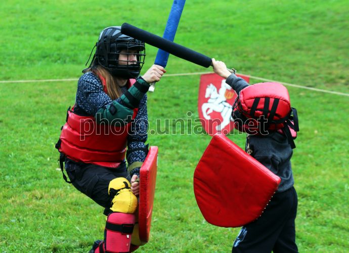 Бои на мечах для детей с использованием безопасных имитаторов холодного оружия и специальной защитной экипировки, в День города, в Ирпене, 11 октября 2025 г. Изюминкой празднования Дня Ирпеня стал рыцарский турнир, в котором приняли участие команды из Львова, Черновцов, Луцка и Ирпеня. Свои соревнования реконструкторы посвятили битве русичей с золотоордынским нашествием, которое произошло у реки Ирпень в 1322 году и завершилось разгромом захватчиков. Фото Синица Александр / УНИАН