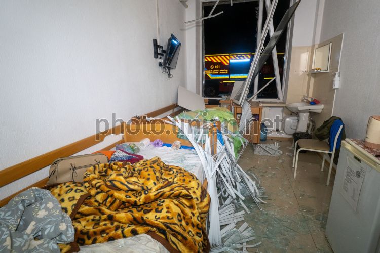 Разбитая палата эндокринологического отделения одной из больниц, возле которой попал российский КАБ, в Харькове, 13 октября 2025 г. В результате ударов РФ по Харькову вечером 13 октября был поврежден корпус медучреждения, в котором лечат людей с эндокринологическими болезнями, в частности сахарным диабетом. В больнице, возле которой попал российский КАБ, находилось более 100 пациентов. 51 пациент больницы испытал острую реакцию на стресс. Пациентов переместили в главный корпус больницы. Четверо больных получили ранения обломками стекла. Фото Мариенко Андрей / УНИАН