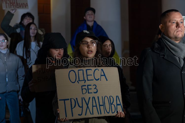 Участники акции против городского головы Геннадия Труханова у здания мэрии в Одессе, 14 октября 2025 г. 14 октября в Одессе у здания мэрии прошел митинг против мэра Геннадия Труханова. Около 150 человек вышли на центральную площадь, чтобы потребовать отстранения от должности и создания в городе военной администрации. Акцию организовала общественная организация "Делаем вам нервы". Участники держали плакаты с надписями "Вата не власть", "Одесса украинский город", "Труханова за решетку" и "Одесса без Пушкина". Участники акции подчеркивают, что готовы продолжать протест до тех пор, пока не будет реакции от государственных органов. Фото Гиманов Александр / УНИАН