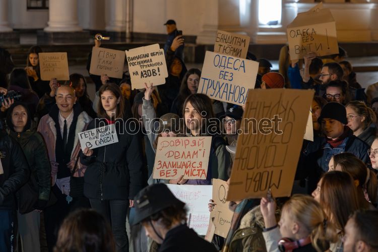 Участники акции против городского головы Геннадия Труханова у здания мэрии в Одессе, 14 октября 2025 г. 14 октября в Одессе у здания мэрии прошел митинг против мэра Геннадия Труханова. Около 150 человек вышли на центральную площадь, чтобы потребовать отстранения от должности и создания в городе военной администрации. Акцию организовала общественная организация "Делаем вам нервы". Участники держали плакаты с надписями "Вата не власть", "Одесса украинский город", "Труханова за решетку" и "Одесса без Пушкина". Участники акции подчеркивают, что готовы продолжать протест до тех пор, пока не будет реакции от государственных органов. Фото Гиманов Александр / УНИАН