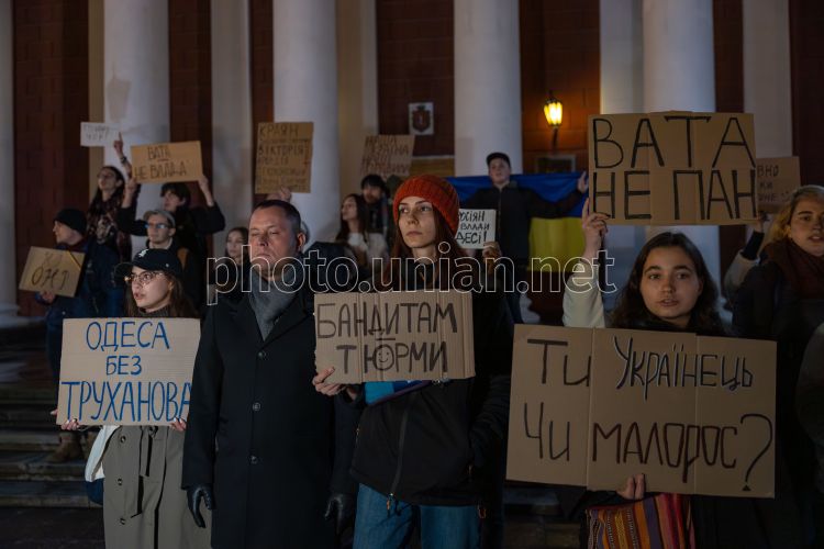 Участники акции против городского головы Геннадия Труханова у здания мэрии в Одессе, 14 октября 2025 г. 14 октября в Одессе у здания мэрии прошел митинг против мэра Геннадия Труханова. Около 150 человек вышли на центральную площадь, чтобы потребовать отстранения от должности и создания в городе военной администрации. Акцию организовала общественная организация "Делаем вам нервы". Участники держали плакаты с надписями "Вата не власть", "Одесса украинский город", "Труханова за решетку" и "Одесса без Пушкина". Участники акции подчеркивают, что готовы продолжать протест до тех пор, пока не будет реакции от государственных органов. Фото Гиманов Александр / УНИАН