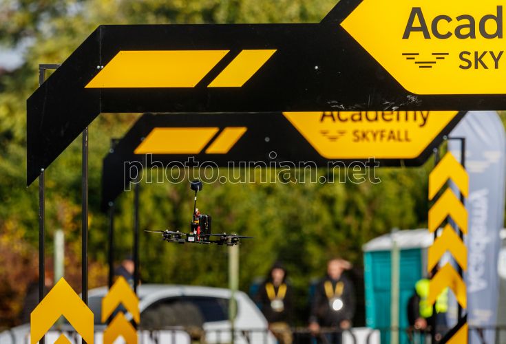 FPV-дрон пролетает по трассе во время Первой Всеукраинской "Студенческой технологической лиги по FPV-гонке", в Закарпатской области, 18 октября 2025 г. В Первых Всеукраинских соревнованиях среди заведений высшего и профессионального образования "Студенческая технологическая лига по FPV-гонке" приняли участие более 300 человек из 50 учебных заведений. Фото Немеш Янош / УНИАН