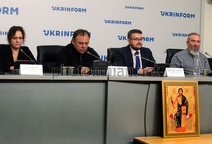 Директор издательского дома «Антиквар» Анна Шерман, директор Музея Шереметьевых Алексей Шереметьев, председатель Украинского института национальной памяти, майор запаса Александр Алферов и иконописец, исследователь иконографии Андрей Комарницкий во время презентации реконструкции тысячелетней украинской иконы, принадлежавшей сыну Владимира Святого черниговскому и тмутороканскому князю Мстиславу, в Киеве, 20 октября 2025 г. В Киеве презентовали научное открытие – реконструкцию тысячелетней украинской иконы, принадлежавшей сыну Владимира Святого черниговскому и тмутороканскому князю Мстиславу. Оригинал иконы не сохранился до настоящего времени. По-видимому, она была утеряна во время монгольского нашествия. Тем не менее, новые методы исторических исследований позволили полностью реконструировать икону, опираясь на источники. Икона представляет собой интересный образец иконописной школы средневекового украинского государства Руси. Этот проект откроет еще ряд утраченных икон, которые вскоре будут открыты с помощью новых исследований.Фото Синица Александр / УНИАН
