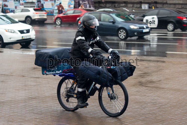 Курьер службы доставки пиццы на велосипеде на улице в Киеве, 19 октября 2025 г. Фото УНИАН