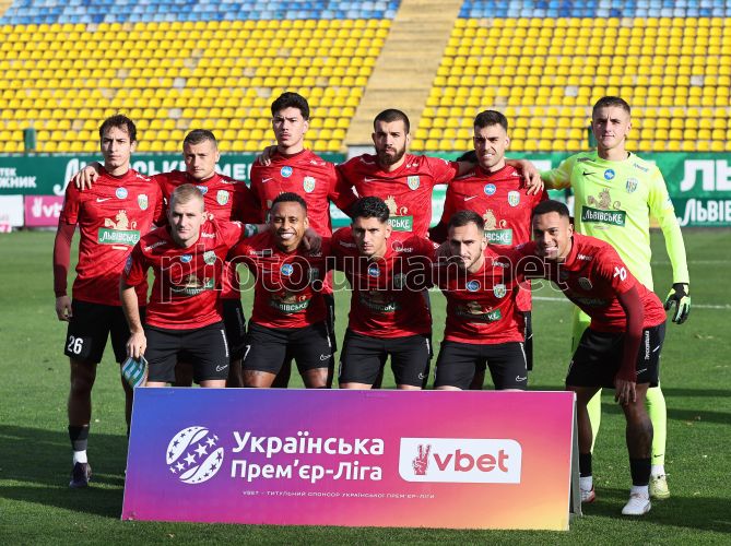 Игроки ФК «Карпаты» (Львов) перед началом матча 10-го тура Чемпионата Украины среди команд УПЛ по футболу (сезон 2025/26) между ФК «Карпаты» (Львов) и ФК «Рух» (Львов) на стадионе "Украина", 25 октября 2025 г. Матч закончился со счетом 0:0. Фото Кравс Евгений / УНИАН