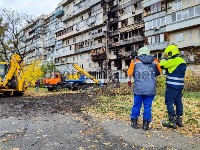 Полуразрушенный и обгоревший фасад жилого дома после ночного попадания дронов в Деснянском районе Киева, 26 октября 2025 г. В Деснянском районе Киева продолжаются аварийно-спасательные работы после российской атаки дронами. В результате попадания погибли три человека: 19-летняя девушка и ее 46-летняя мать, еще одно тело нуждается в идентификации. Фото Синица Александр / УНИАН