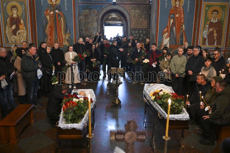 Церемония прощания с погибшими журналисткой и оператором телеканала FreeДом Еленой Губановой (творческий псевдоним - Елена Грамова) и Евгением Кармазиным в Михайловском соборе в Киеве, 27 октября 2025 г. Елена Губанова и Евгений Кармазин погибли от удара российского дрона в Краматорске. На прощание в Михайловском Златоверхом соборе собралось ориентировочно до 100 человек. Это родные, друзья и журналисты. Фото Ратынский Вячеслав / УНИАН