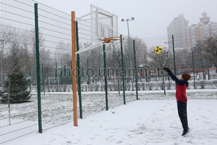 Мальчик играет в мяч на заснеженной спортивной площадке в Киеве