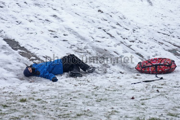 Мальчик с тюбингом на заснеженной улице в Киеве, 14 декабря 2025 г. Утром воскресенья, 14 декабря, столицу Украины засыпало первым снегом. Первый снег в столице начал падать еще около шести часов утра. Фото Ковальчук Виктор / УНИАН