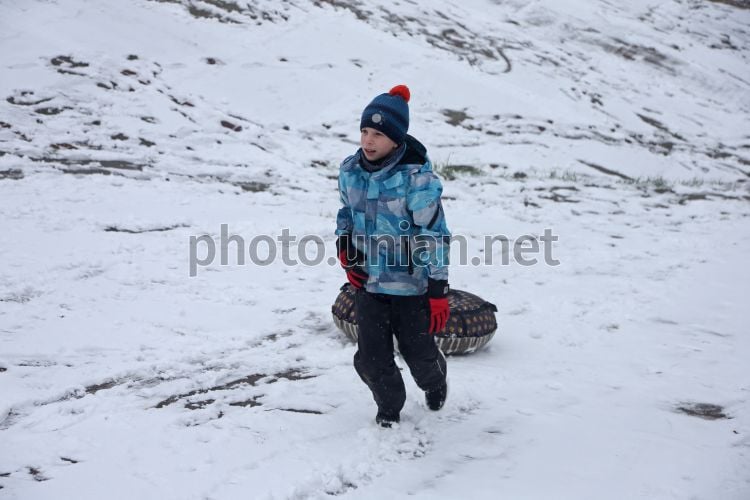 Мальчик с тюбингом на заснеженной улице в Киеве