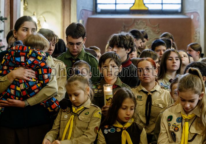 Пластуны во время торжественной передачи Вифлеемского огня мира в Ужгороде, 14 декабря 2025 г. В этот день в Ужгородском греко-католическом кафедральном соборе словацкие скауты торжественно передали закарпатским пластунам Вифлеемский огонь мира. После церемонии пластуны передадут Огонь в больницы, школы и повезут на передовую. Фото Немеш Янош / УНИАН
