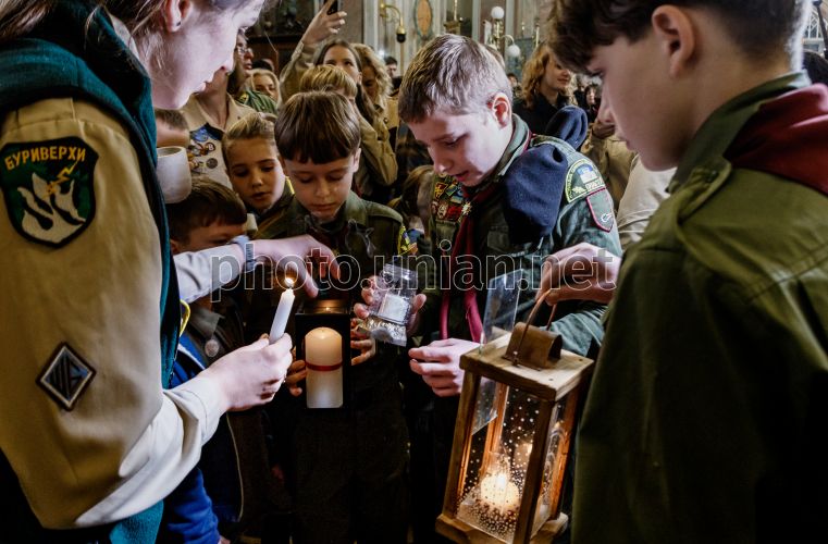 Пластуны во время торжественной передачи Вифлеемского огня мира в Ужгороде, 14 декабря 2025 г. В этот день в Ужгородском греко-католическом кафедральном соборе словацкие скауты торжественно передали закарпатским пластунам Вифлеемский огонь мира. После церемонии пластуны передадут Огонь в больницы, школы и повезут на передовую. Фото Немеш Янош / УНИАН