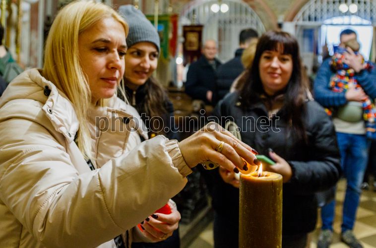 Греко-католические верующие забирают частицу Вифлеемского огня мира в свои дома после Божественной литургии в Ужгороде, 14 декабря 2025 г. В этот день в Ужгородском греко-католическом кафедральном соборе словацкие скауты торжественно передали закарпатским пластунам Вифлеемский огонь мира. После церемонии пластуны передадут Огонь в больницы, школы и повезут на передовую. Фото Немеш Янош / УНИАН