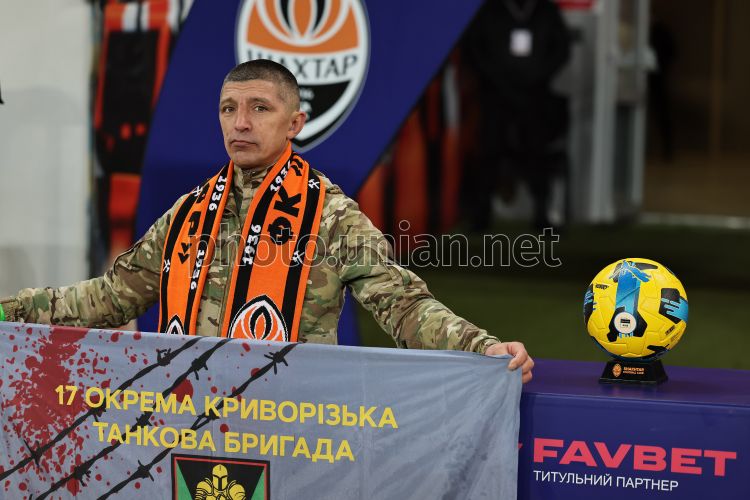 Болельщик "Шахтера", военный 17-й Отдельной Криворожской танковой бригады Щедоров сделал символический первый удар по мячу во время матча 16-го тура Чемпионата Украины среди команд УПЛ (Премьер-лига) по футболу (сезон 2025/26) между ФК "Шахтер" (Донецк) и ФК "Эпицентр" (Каменец-Подольский), во Львове, 14 декабря 2025 г. Матч закончился со счетом 5:0 в пользу ФК "Шахтер". Фото Кравс Евгений / УНИАН