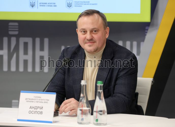 Председатель Госкино Украины Андрей Осипов во время пресс-конференции, посвященной развитию украинского спортивного кино, в пресс-центре УНИАН в Киеве, 19 декабря 2025 г. Прессконференция с участием Президента Национального олимпийского комитета Украины и Председателя Государственного агентства Украины по кино была посвящена развитию украинского спортивного кино и перспективам сотрудничества между спортивной и кинематографической отраслями. В ходе мероприятия участники обсудили роль спортивного кино как важного культурного продукта, который формирует национальные ценности, популяризирует спорт, демонстрирует силу характера, выносливость, взаимоподдержку и преодоление личных вызовов. Фото Ковальчук Виктор / УНИАН