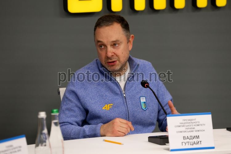 Президент Национального олимпийского комитета Украины, олимпийский чемпион Вадим Гутцайт во время пресс-конференции, посвященной развитию украинского спортивного кино, в пресс-центре УНИАН в Киеве, 19 декабря 2025 г. Прессконференция с участием Президента Национального олимпийского комитета Украины и Председателя Государственного агентства Украины по кино была посвящена развитию украинского спортивного кино и перспективам сотрудничества между спортивной и кинематографической отраслями. В ходе мероприятия участники обсудили роль спортивного кино как важного культурного продукта, который формирует национальные ценности, популяризирует спорт, демонстрирует силу характера, выносливость, взаимоподдержку и преодоление личных вызовов. Фото Ковальчук Виктор / УНИАН